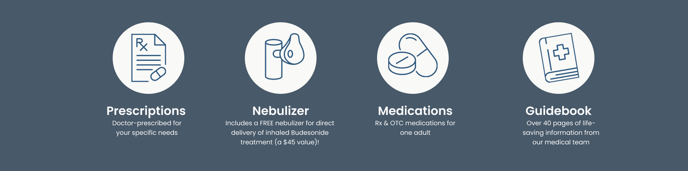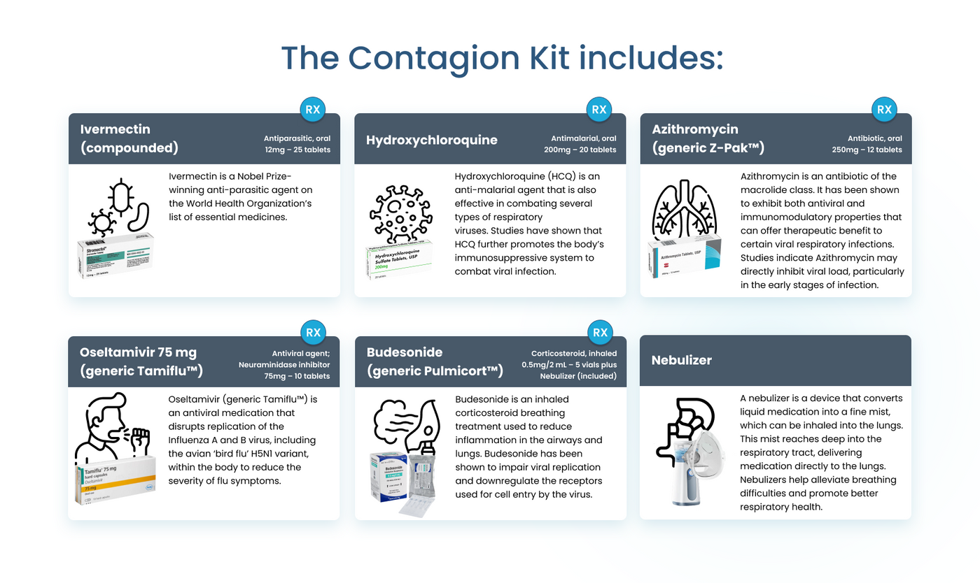 Backed by protocols developed by experts like Dr. Peter McCullough, get Ivermectin, Hydroxychloroquine, Azithromycin (generic Z-Pak™), Oseltamivir (generic Tamiflu™) and Budesonide along with a nebulizer. Our kit also includes a Guidebook as an educational resource for safe emergency use.