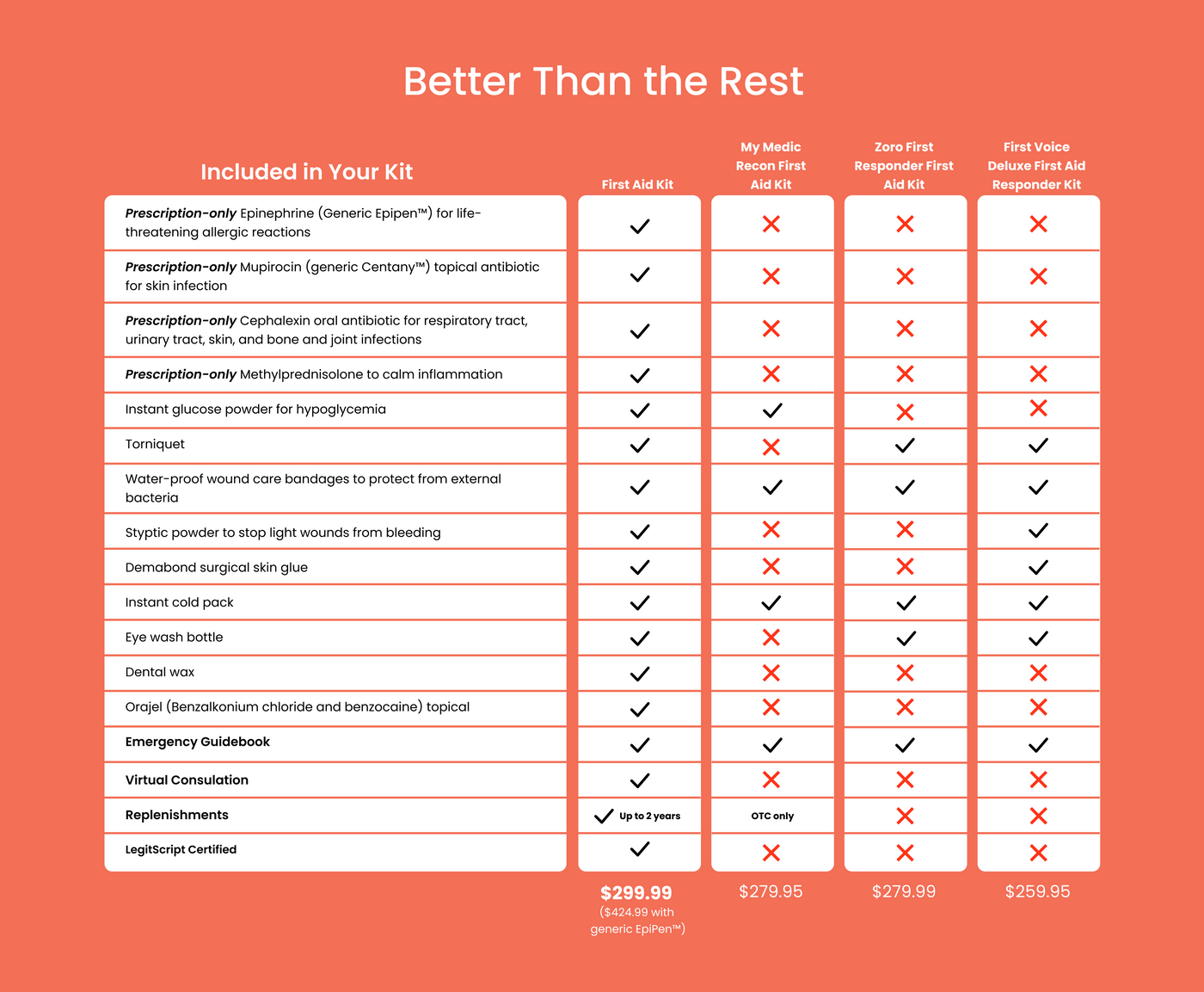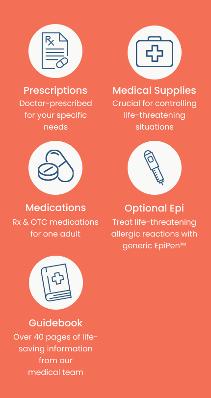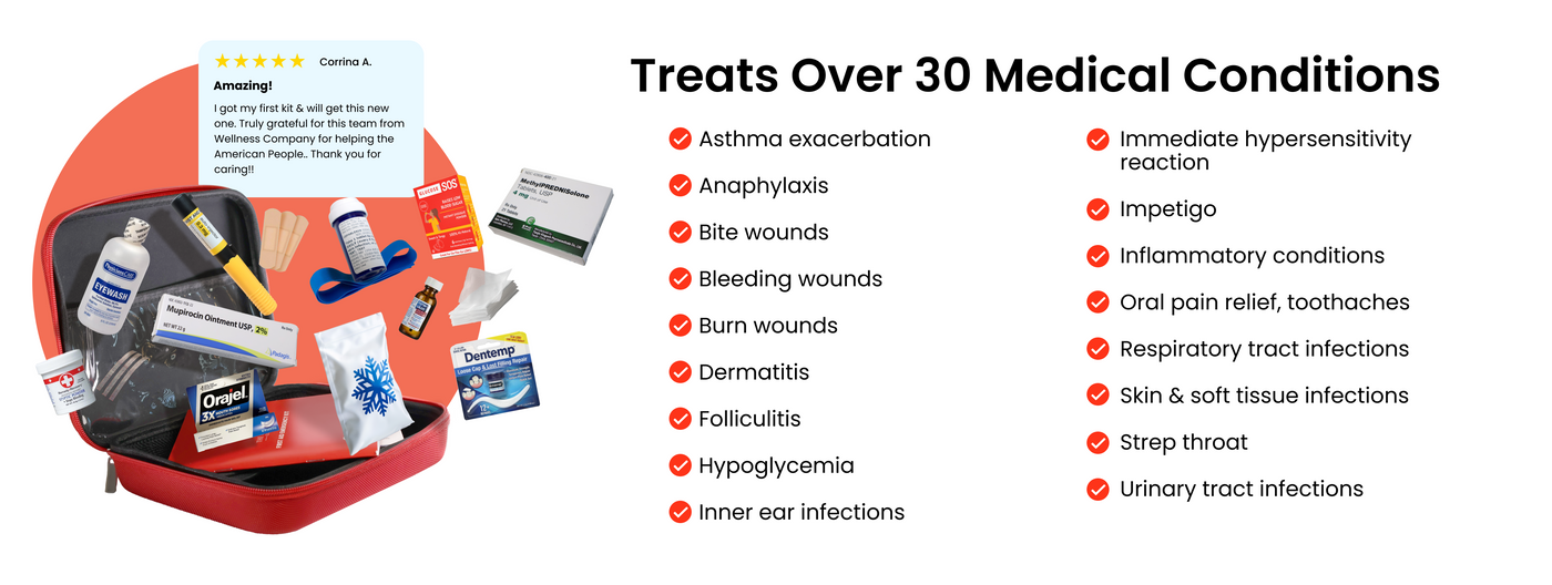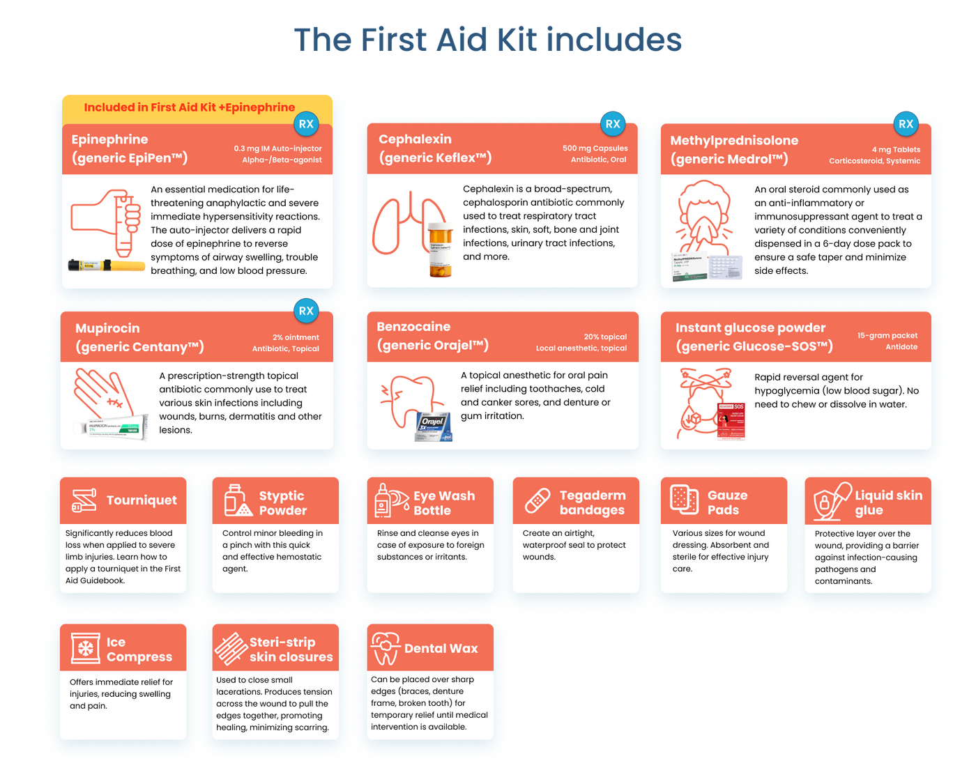 Includes cephalexin, methylprednisolone (generic Medtrol), Mupirocin (generic Centany), Benzocaine (generic Orajel), instant glucose powder, and much more – and the Plus version includes a generic EpiPen.